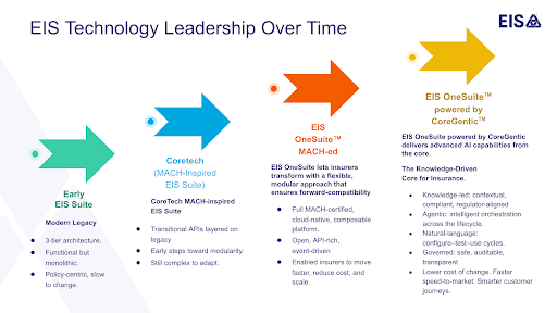 Our latest Evolution, EIS OneSuite powered by CoreGentic, builds on the strong, future-proof foundation of EIS, and not only enables AI solutions better than most core systems on the market, but also embeds agentic orchestration into the core of how insurance works.